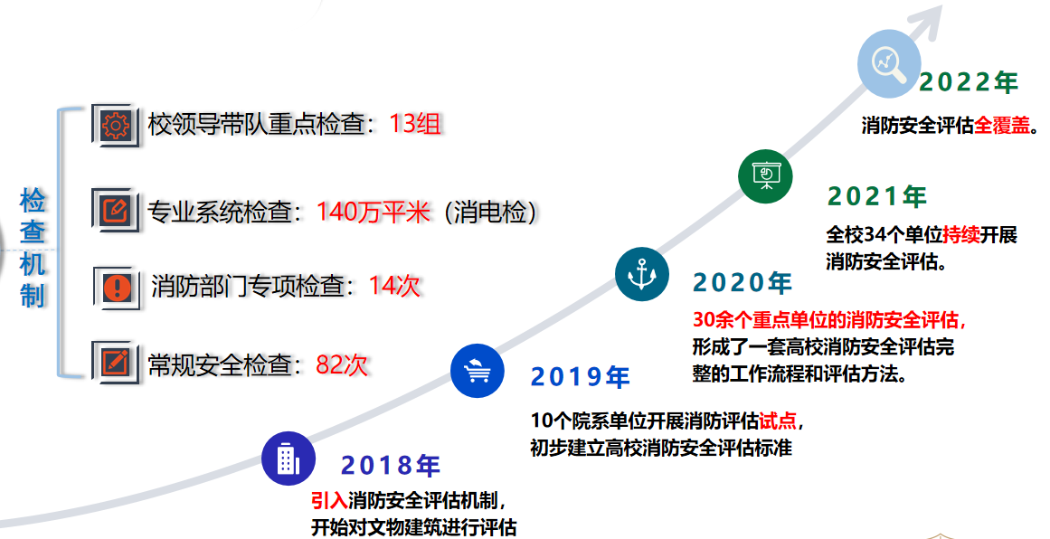 加强消防安全标准化管理,持续强化消防安全隐患排查整治。督促指导各单位开展深层次的风险隐患排查检查,实现消防设施检测和电气防火检测全覆盖,建立隐患台账,有计划、分年度开展重大隐患整改,教学科研区和学生区火灾责任事故逐年降低。2019年开始,借鉴《火灾高危单位消防安全评估导则》中的消防安全评估方法,对全校建筑和相关实验室进行消防安全评估,探索适合高校实际情况的消防安全评估标准,已完成三期消防评估,对90个单位150栋(处)建筑的110余万平米进行评估,2022年将完成全部建筑的评估。